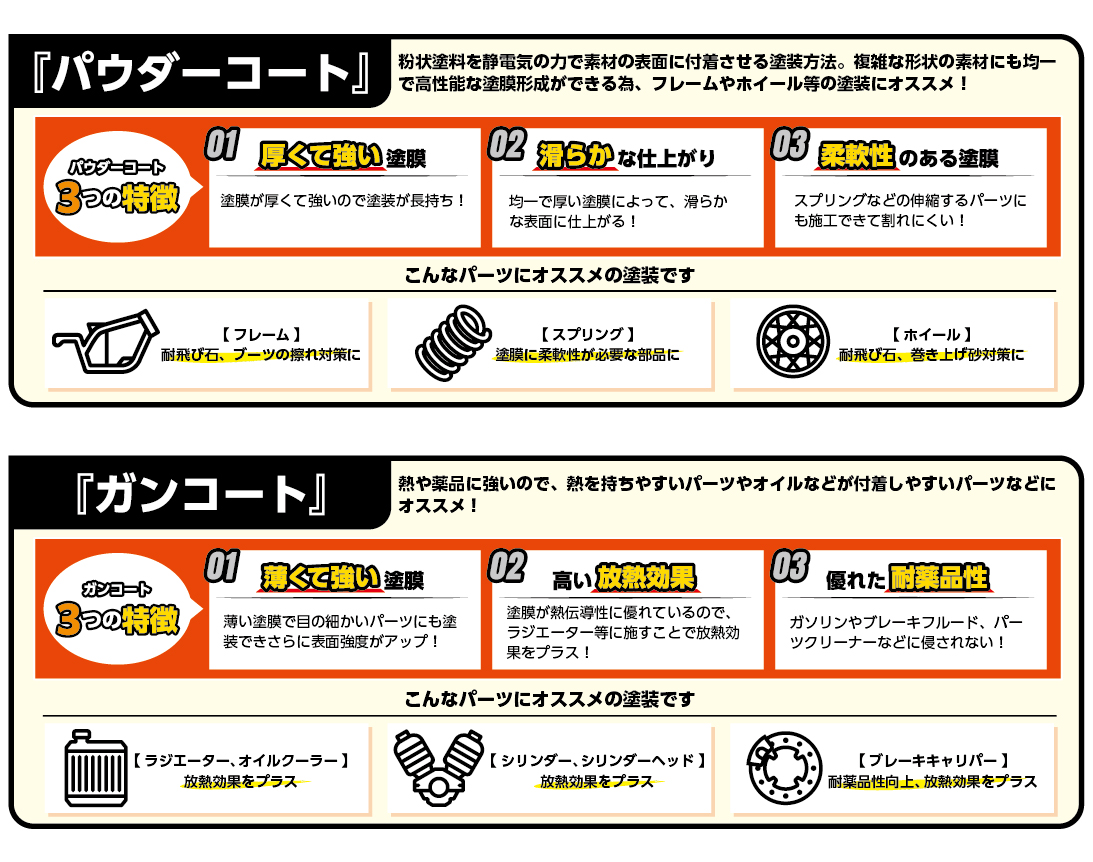 パウダーコートとガンコートどちらも【塗装】と言っても、それぞれの塗料で特性が異なって適したパーツも変わってきます。