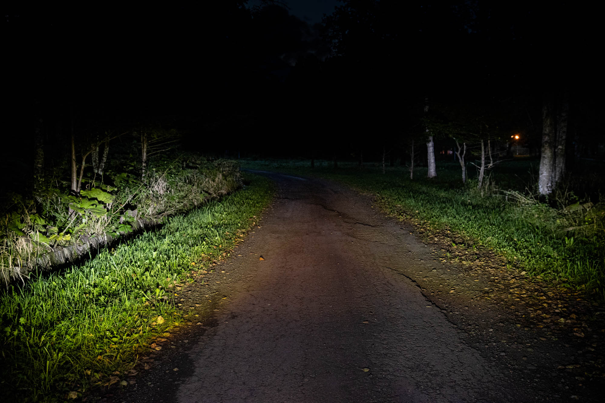 実際にヤマハセロー250に装着して北海道の長い長い林道に入ってみました。たまたま取材の機会を得たのですが、熊の出没情報が多いためとても恐怖感が強く、試しにヘッドライトだけで林道に入ってみると心臓がバクバクして走りづらいことこの上ありませんでした。すかさずフォグライトをオンにすると、その差は一目瞭然。フォグライトをヘッドライトのハイビームと同じ高さに合わせ、横方向にワイドに開いたセッティングにすると、これまで闇に隠れていた路肩やカーブの先が浮かび上がります。夜の林道を走るときに常に付きまとう「先の見えない不安」がぐっと減り、安心して走れるようになりました。バイクを安全に走らせる上で最も大事なのは、精神的にリラックスすることだと思います。そういう意味で、フォグライトはどんな装備よりも安全性を高めてくれる装備かもしれません。