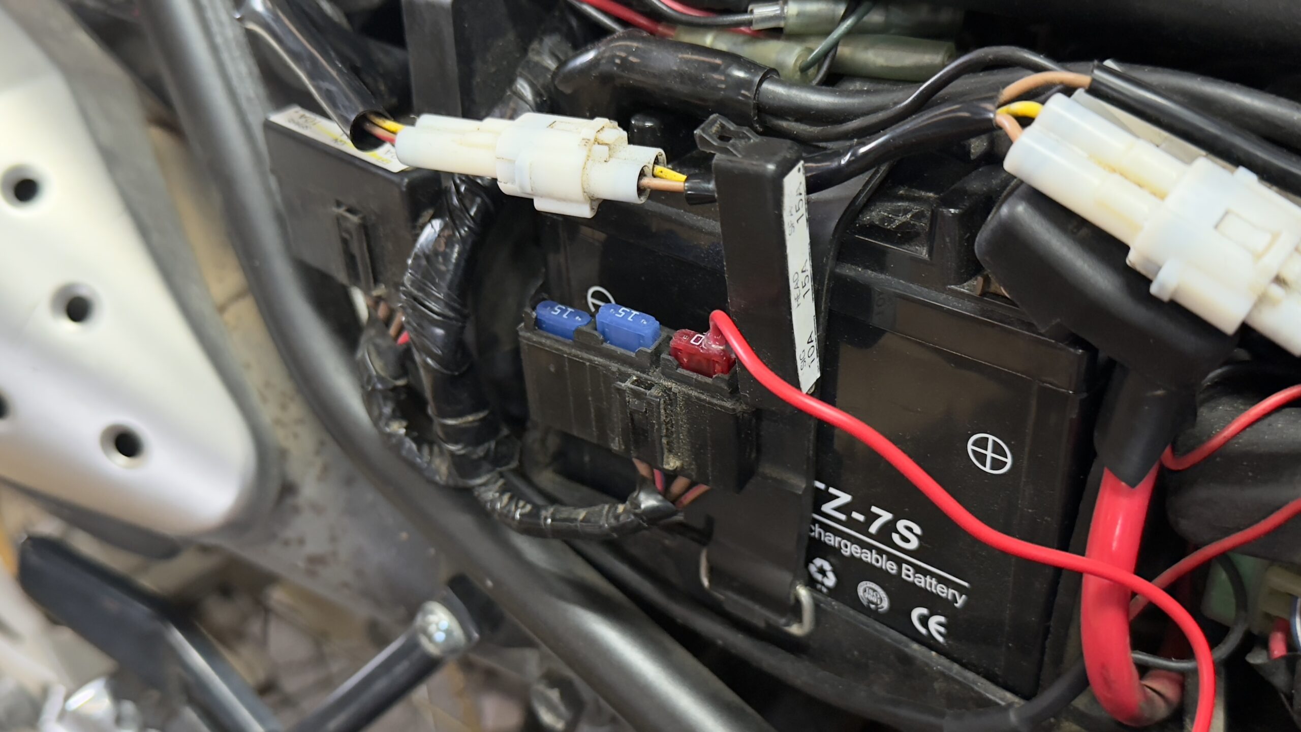 また、配線については年式による違いがあります。最新型のセロー250であればテールランプの配線に専用カプラーを割り込ませるだけで装着可能ですが、旧型はカプラー形状が異なるためそのままでは合いません。しかし本体の消費電力は合計でも30Wと小さいため、10Aヒューズから電源を取れば問題なく動作します。今回テストした旧型セローでは、シグナル用の10Aヒューズから電源を取りました。