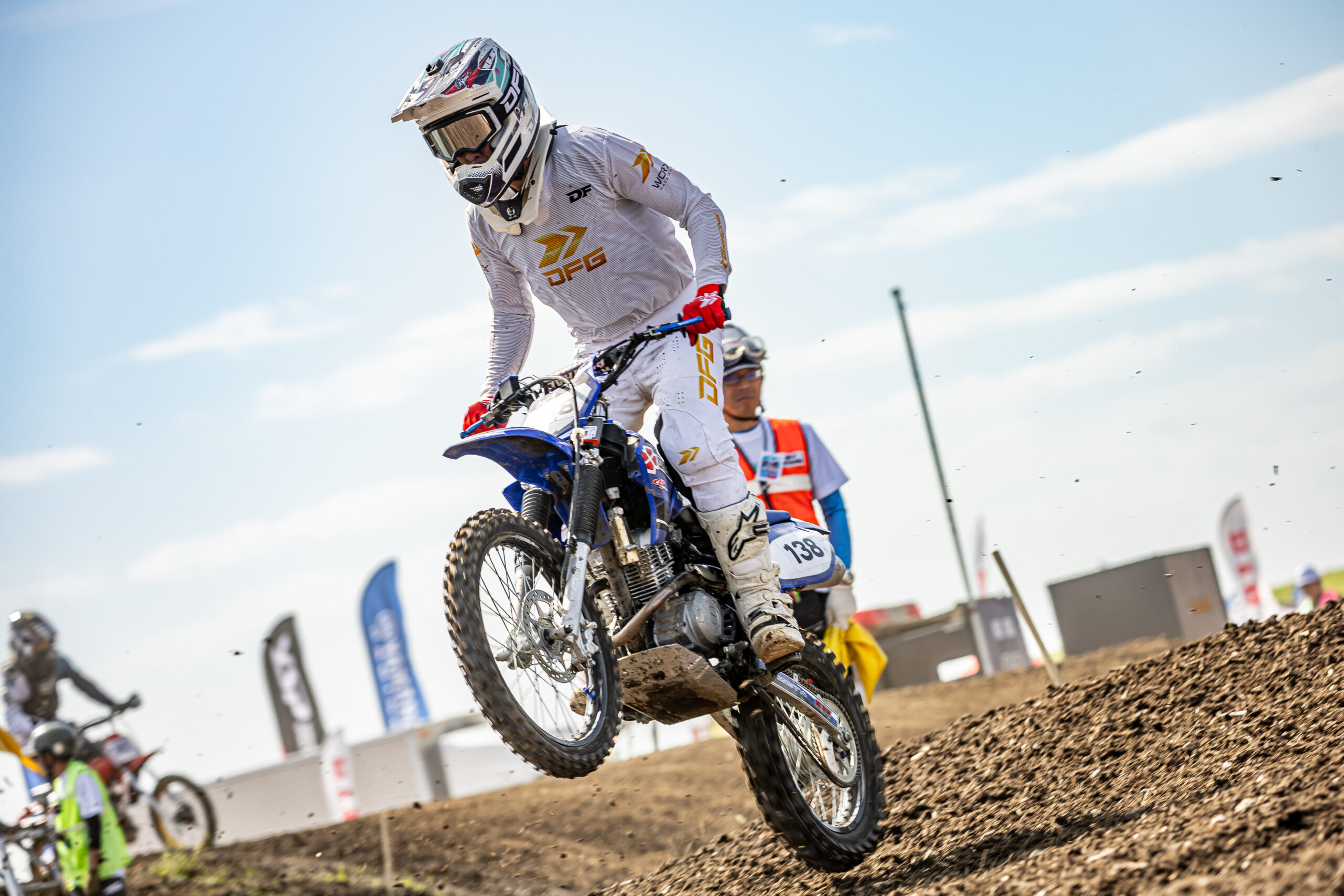 オフロードヴィレッジで行われる大会では、”参加型の全日本モトクロス”をテーマに、競技ライセンスを持っていない人でも参加できる入門クラスが用意されている。その中の一つとして、モトクロスのエントリーマシンとして人気の高い小排気量マシンでレースを行う「ファンバイククラス」が開催され、弊社ダートフリーク代表取締役社長である石田(通称:DFシャチョー)がヤマハ TT-R125LWEに乗って参戦した。
