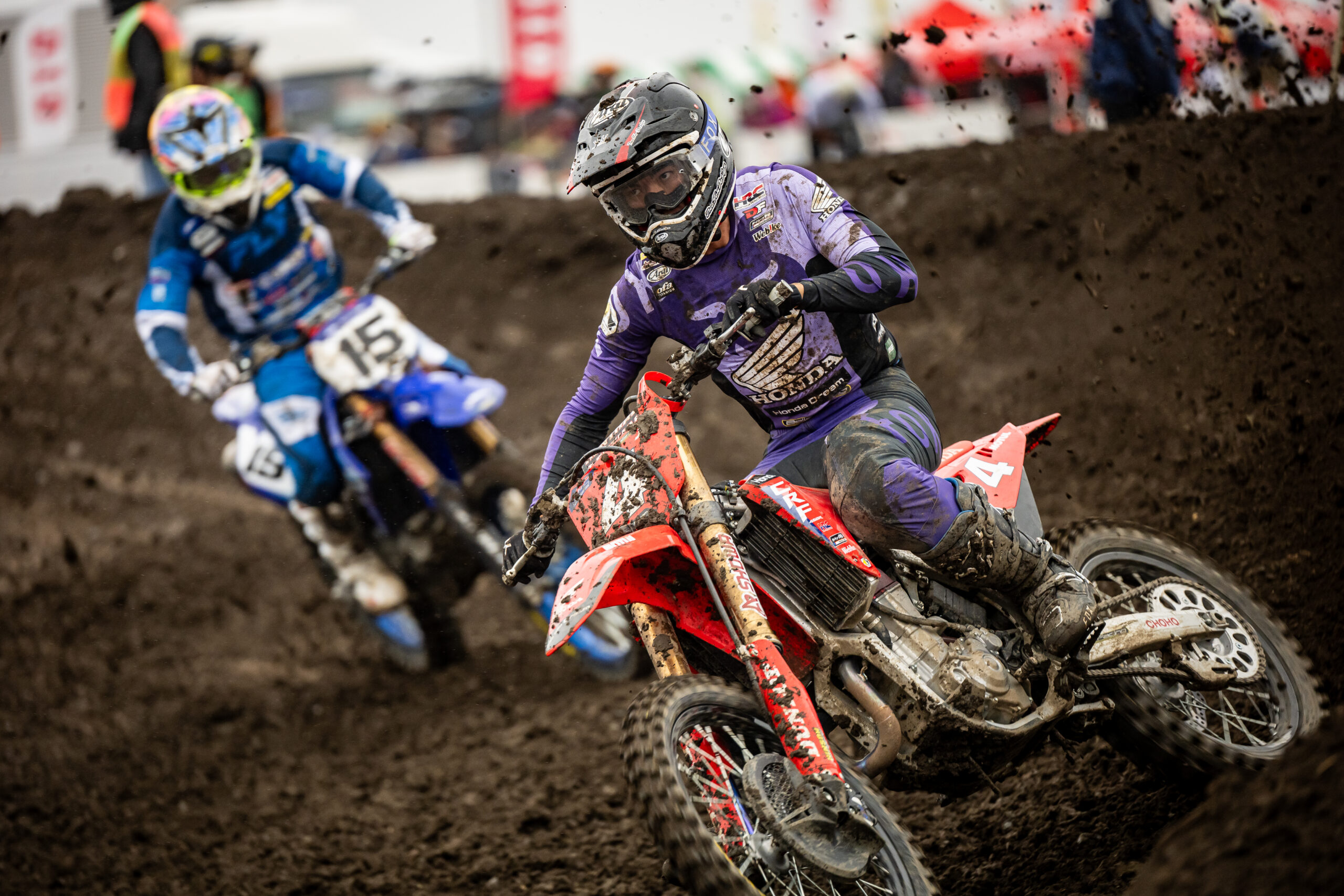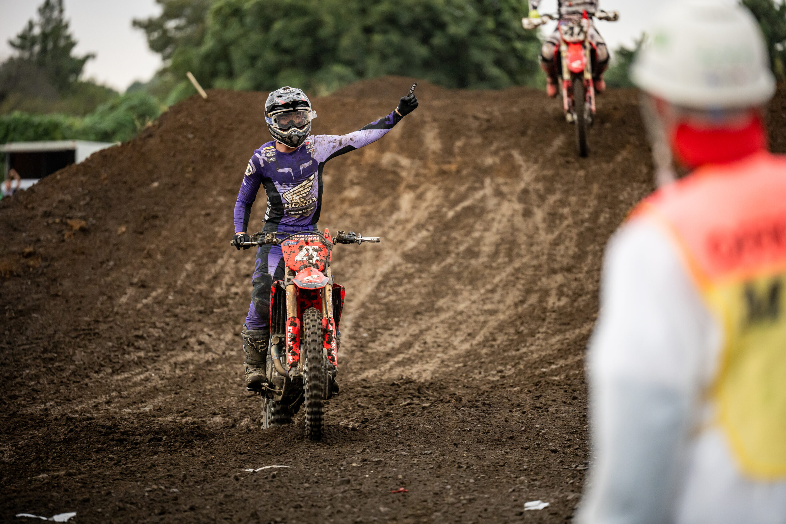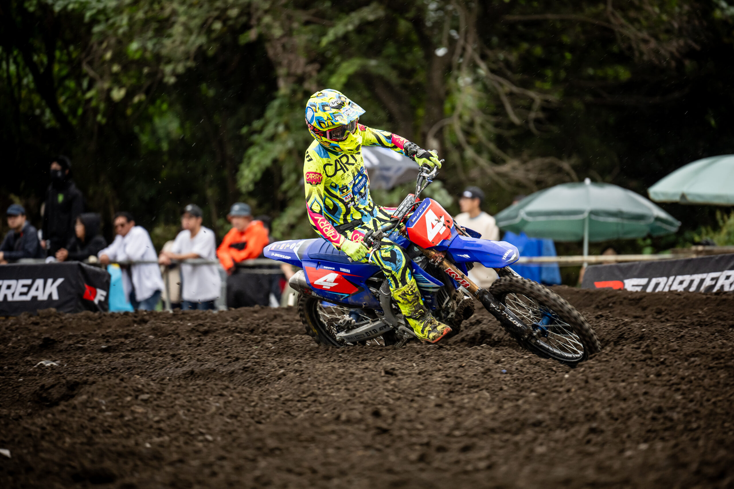会場のオフロードヴィレッジはリズムセクションやジャンプ、タイトコーナーなどテクニカルなセクションが多いレイアウトが特徴。当日はお昼ごろから雨が降り始め、ヒートごとに変化していく路面状況でどれだけスピードを上げられるか、ライダーたちの対応力が発揮されるレースとなった。