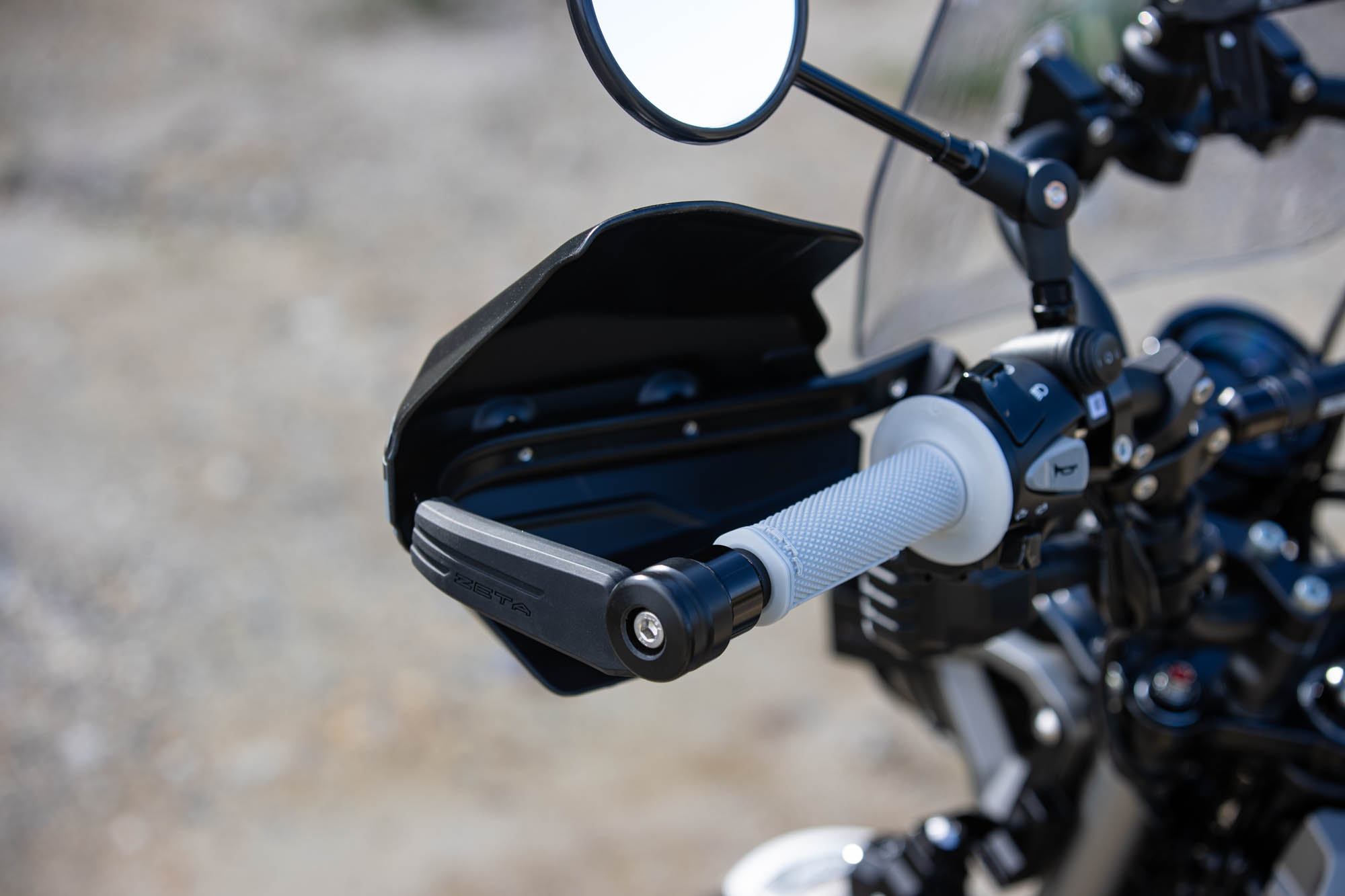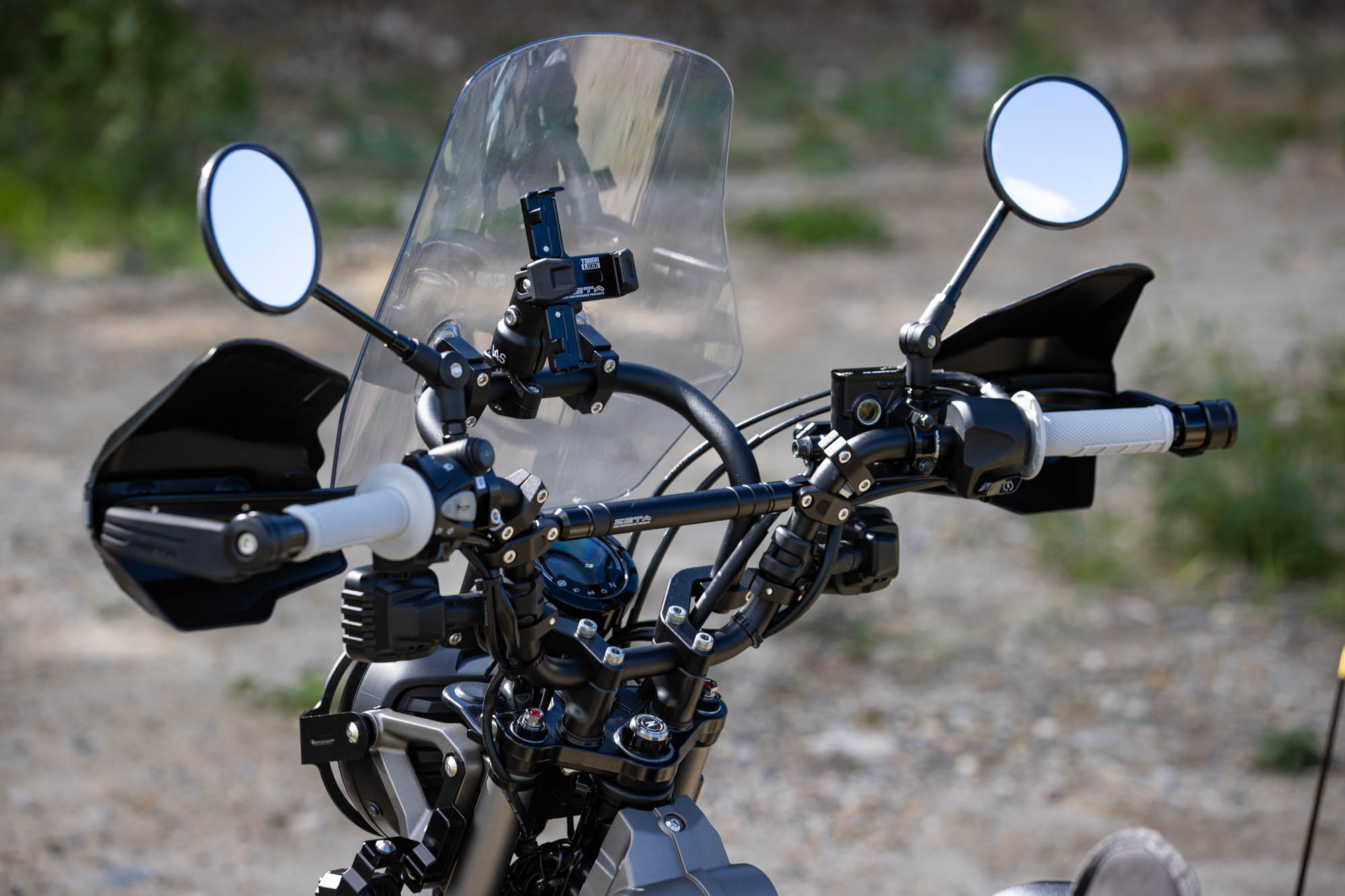 フロント周りには「アドベンチャーウィンドシールド」を装備し、モバイルマウントと一体化したスクリーンが長距離移動の疲労を軽減。さらに、ハンドガードには防風効果の高い「スクードプロテクター」を組み合わせた「アドベンチャーアーマーガード」を採用することで、走行中の雨風や障害物からライダーの手元を鉄壁の守りで保護します。