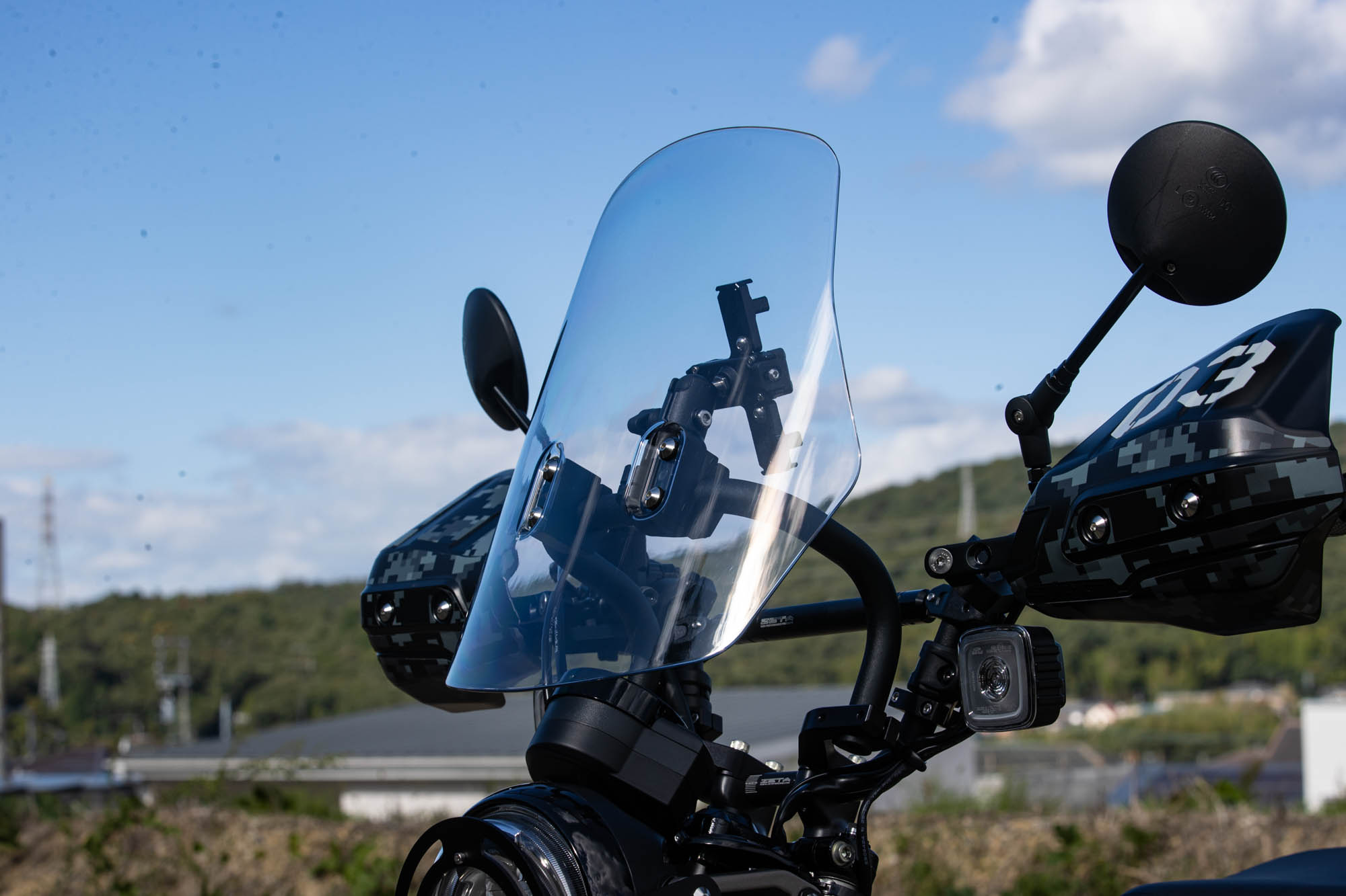 スクリーンとモバイルマウントが一体となったスクリーンキット。防風効果の高いラージタイプを採用し、ツーリングの快適性を向上。