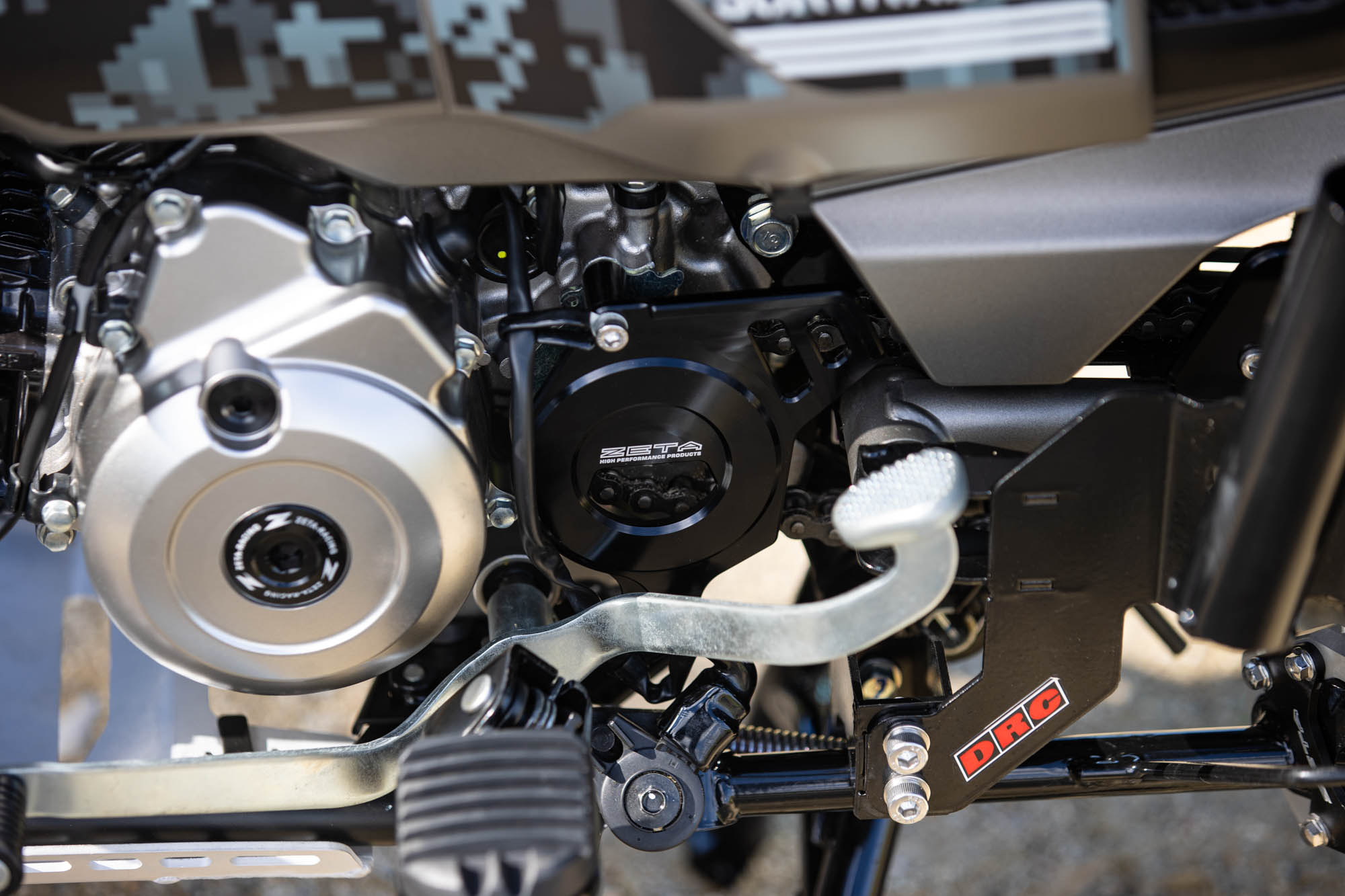 4年前に制作した、ダートフリークのカスタムバイク「CT125 SURVIVAL ADV」からさらにミリタリーテイストをアップデート。その名も「CT125 SURVIVAL ADV2」を発表しました。最大のポイントである「グラフィックキット デジカモ ブラック」は、ヤマハセロー用としてもすでに発売済みですが、CT125ハンターカブにあわせて細かなパーツに分割、デカールの厚みも最適化することで、オフロードバイク特有の分厚いデカールに慣れていない方でも一人で貼り付けることができます。