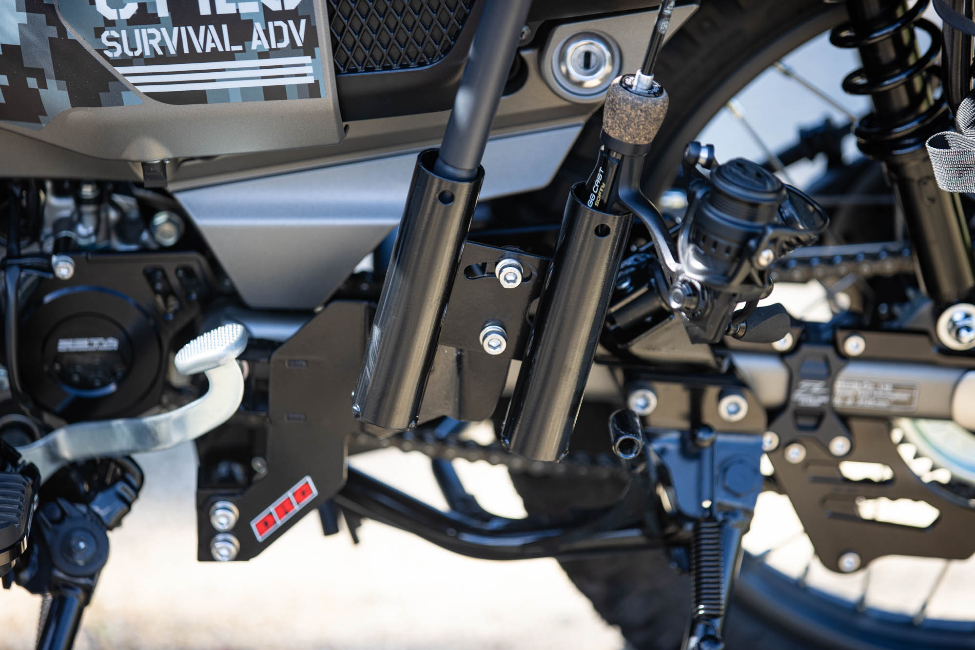 釣り竿を2本まで装着でき、角度調節も可能。竿のグリップ径30mmまで対応し、バイクでの釣行を強力にサポート。