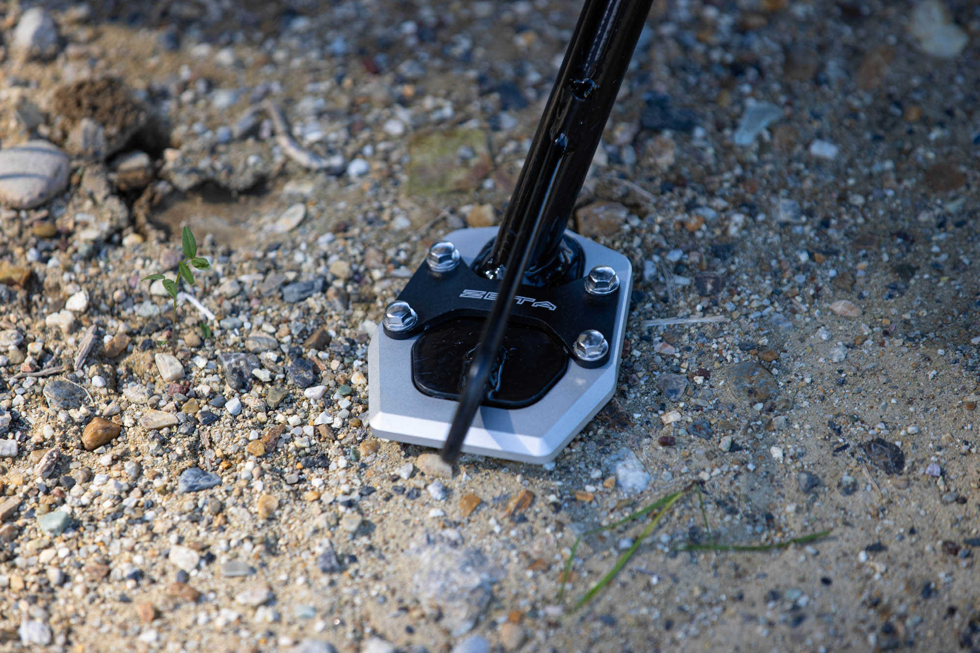 純正より接地面積を拡大し、砂地や砂利などの不安定な場所でもサイドスタンドが埋まってしまうのを防ぎます。
