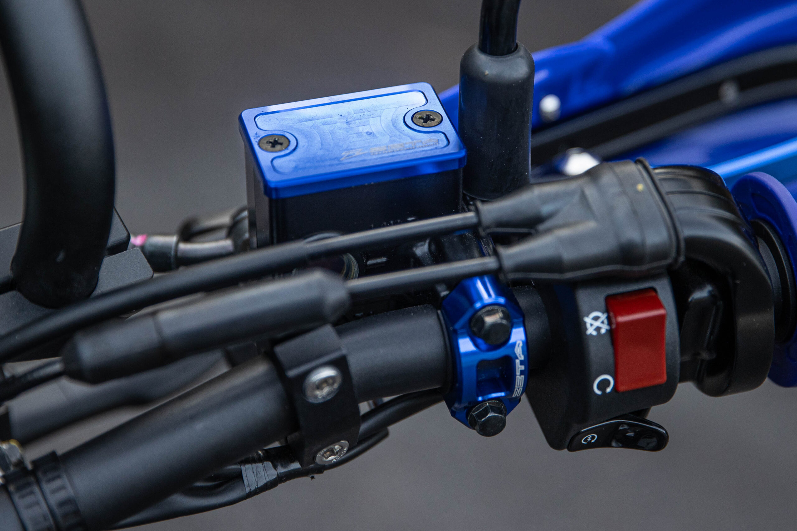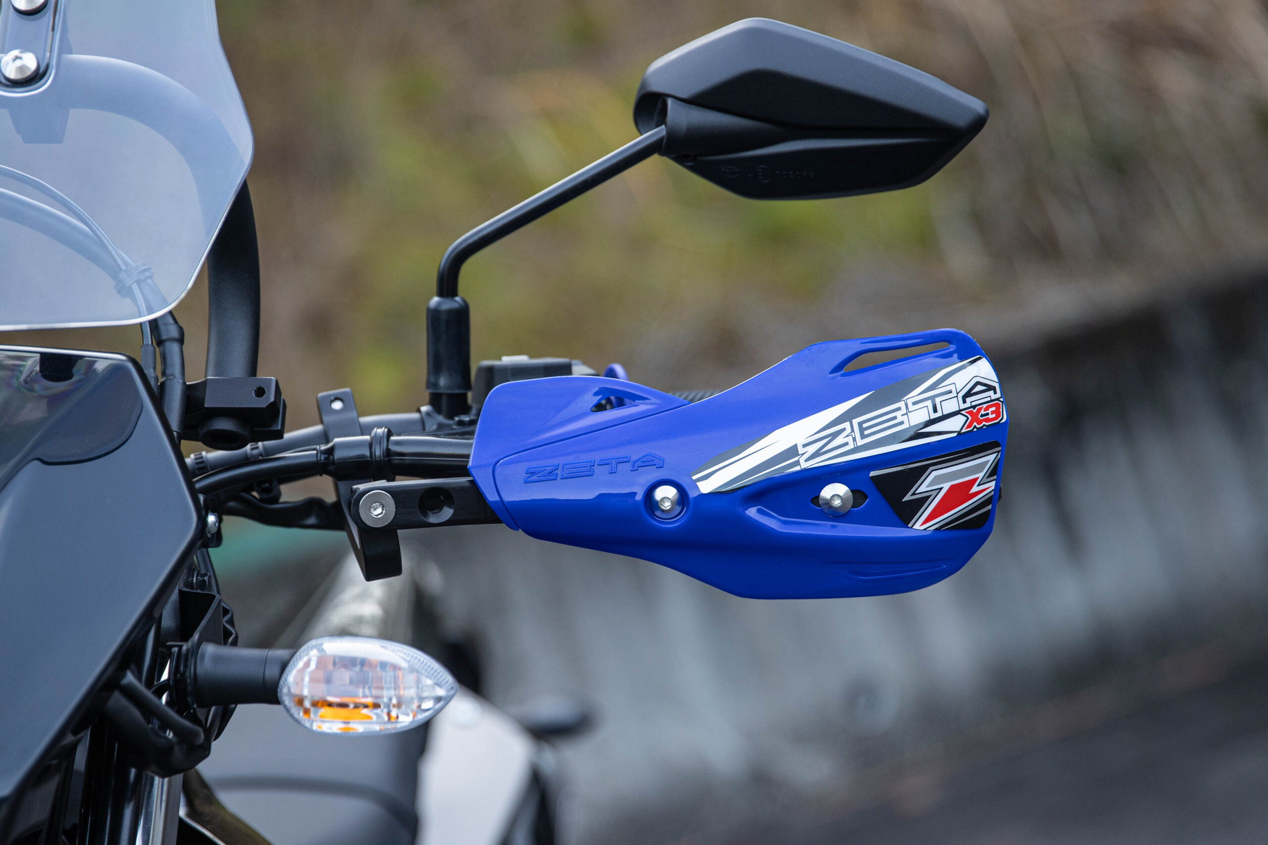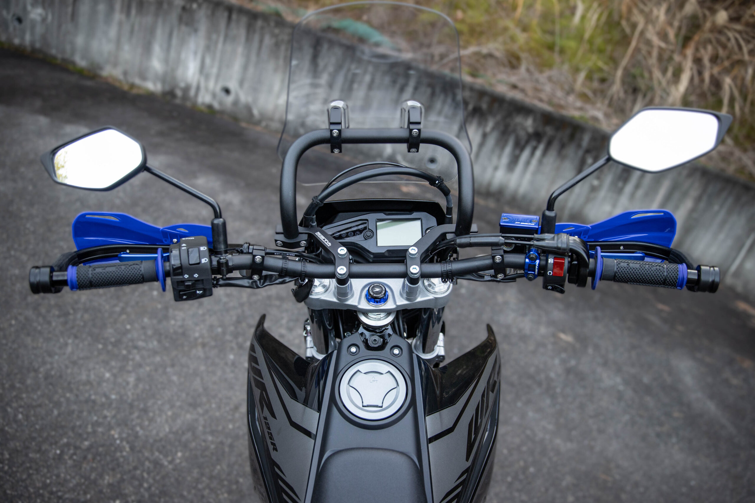 ダートフリークで取り組んだカスタムWR125Rは、オフロードネイティブな仕様です。ハンドル回りには転倒時に折れたり曲がったりすることのないZETA RACINGピボットレバー、そしてハンドガードを装備。林道ツーリングでの長距離移動を意識して、このハンドルにはZETA RACINGアドベンチャーウインドシールドも装着しました。