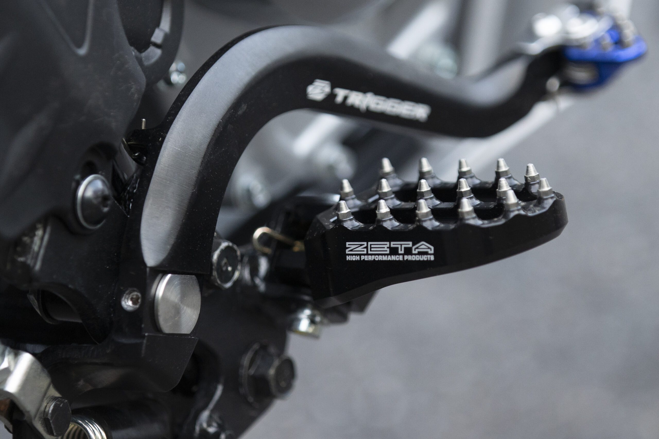 高強度なA2014材をCNC加工で削り出したワイドフットペグ。純正よりも前後幅を広く設計することで、スタンディング時の安定感とコントロール性を大幅に向上。排泥性に優れたデザインにより、泥詰まりによるグリップ低下も防ぎます。