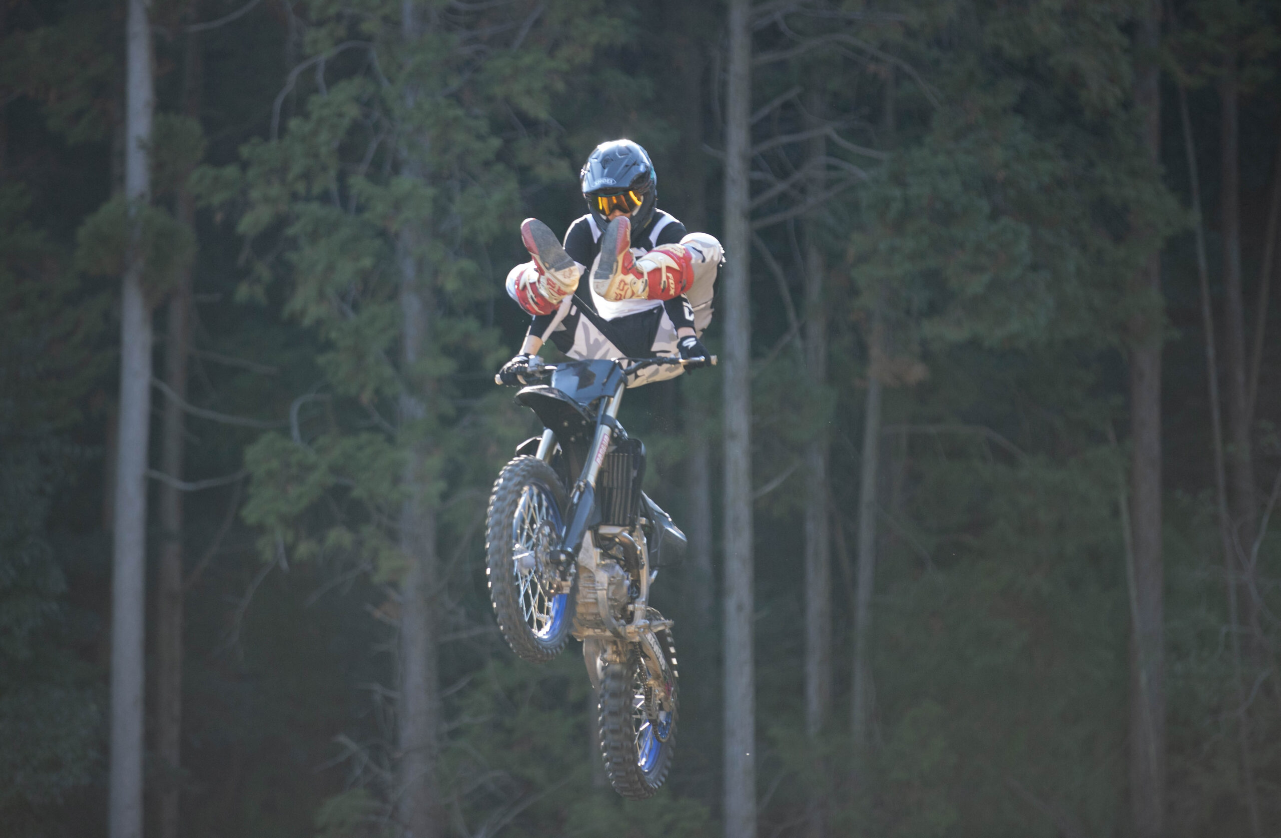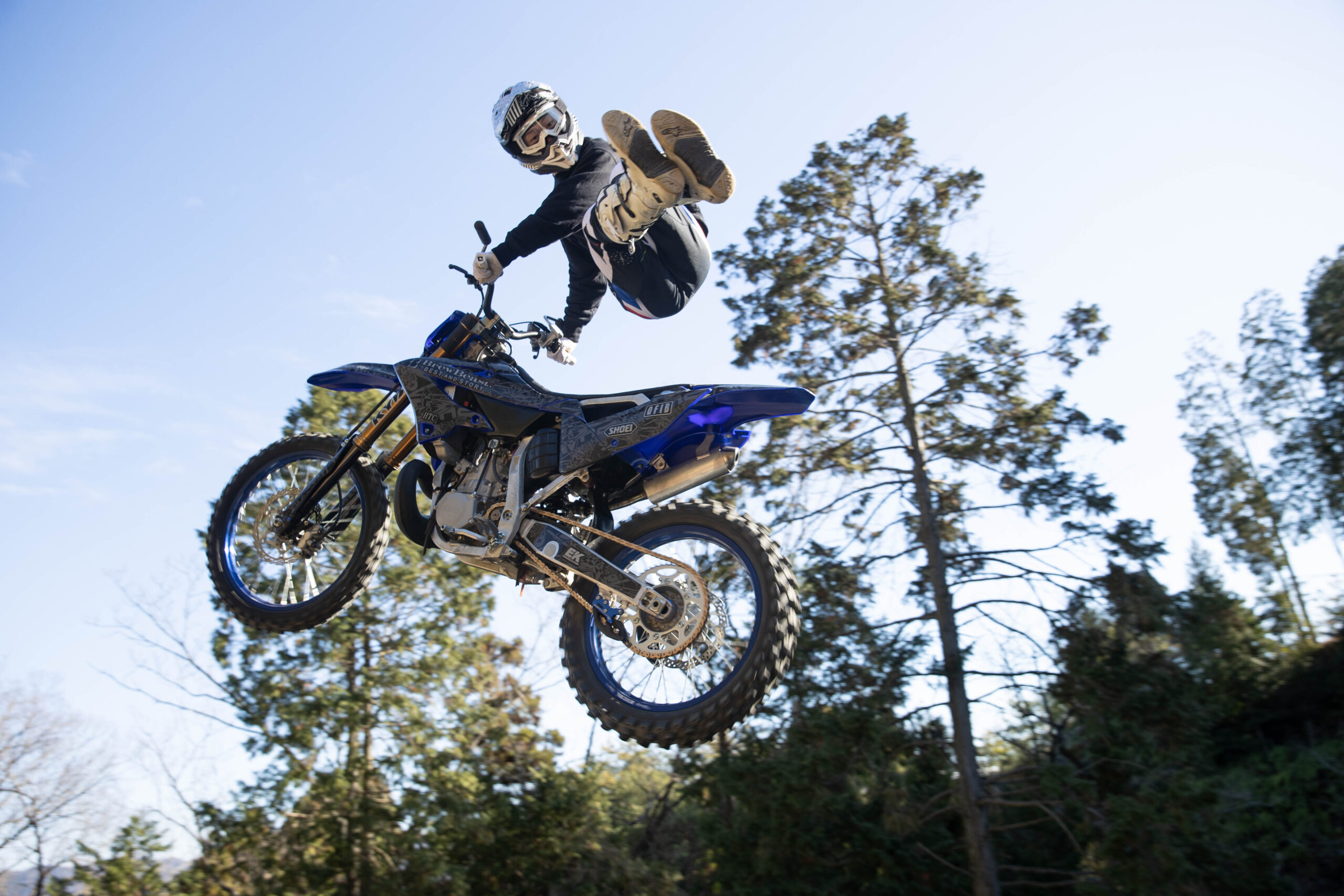 「ヒールクリッカーはハンドルの前で足をカチンと合わせるトリックです。マシンから足を離す基礎的な動きが含まれていて、FMXライダーが最初に取り組む代表的な技です」