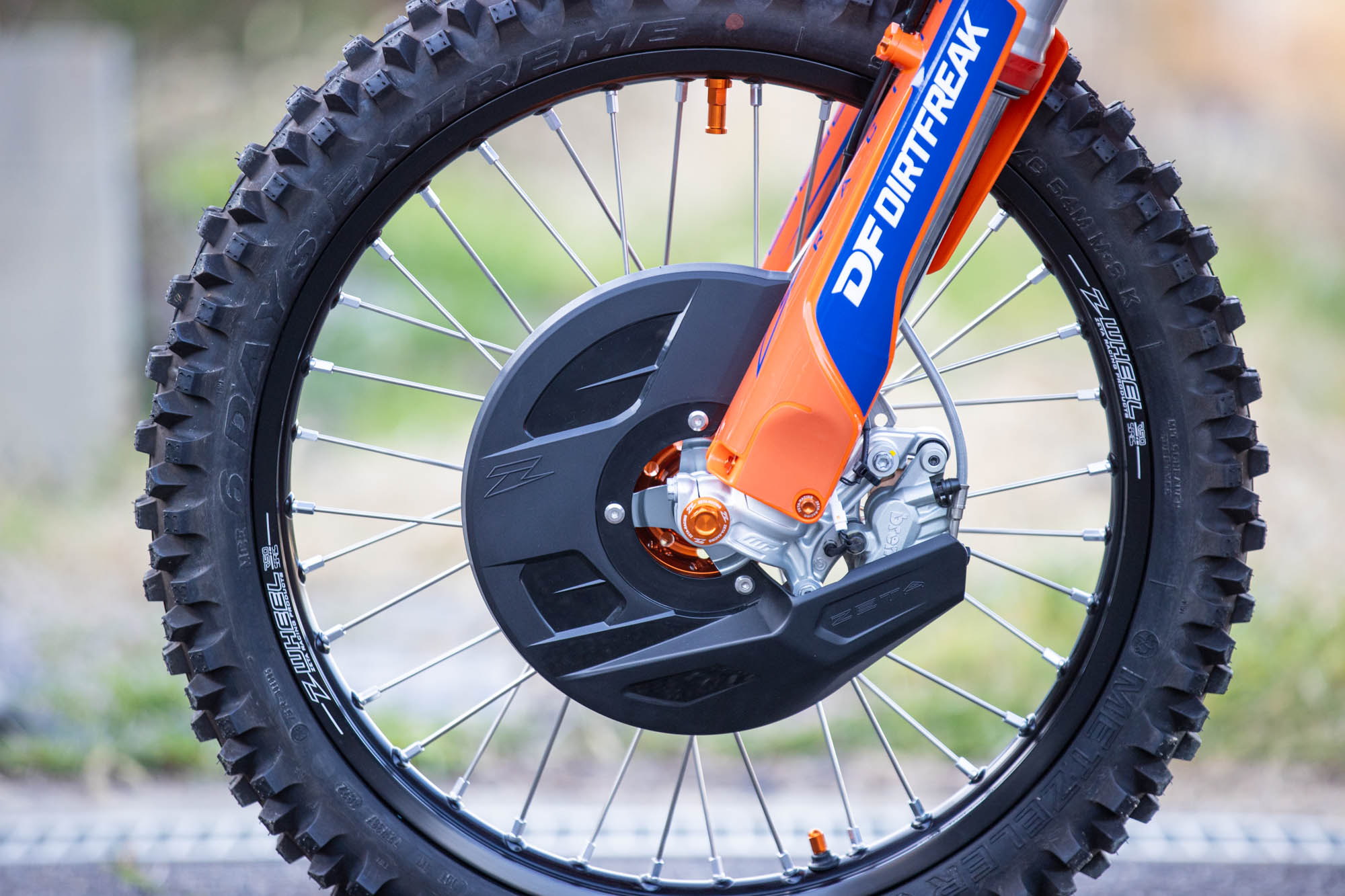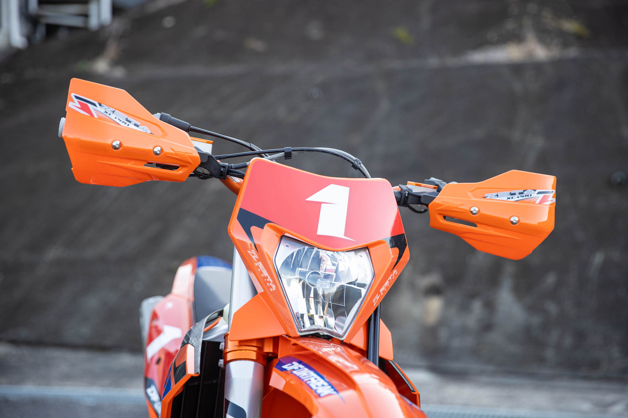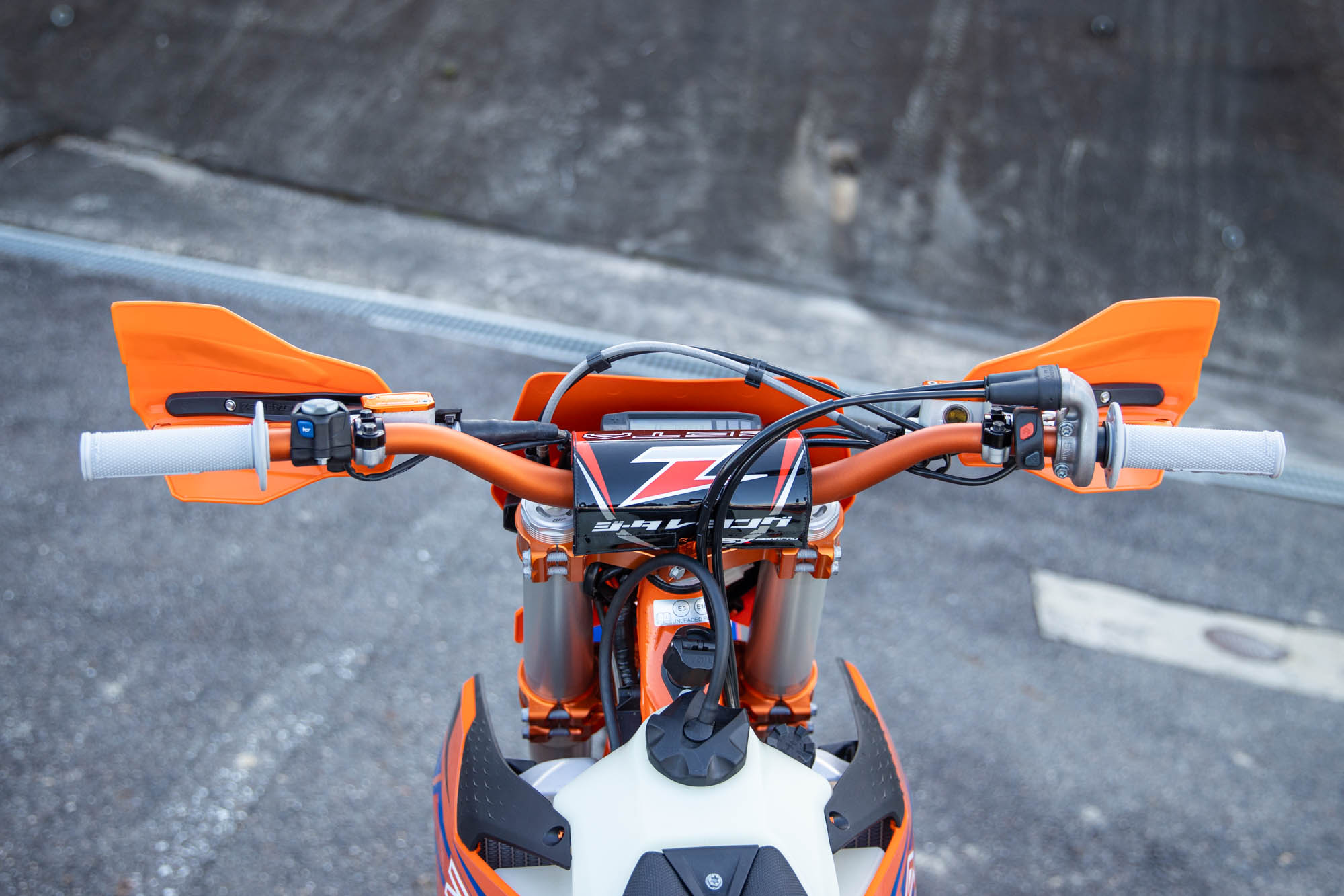ハンドルバーには、高強度・柔軟性・軽量化を高次元でバランスさせたSX3ハンドルバーを採用。これに、転倒時の破損リスクを最小限に抑える可倒式ピボットレバーセットと、KTM純正のマウントにZETA RACING製ハンドガードを装着可能なXC PROコンバートハンドガードをチョイス。これにより、タイトなウッズやガレ場でも、クラッシュによるレバー折損などを恐れることなく攻めることができ、かつオープンガードで操作感も軽量に。