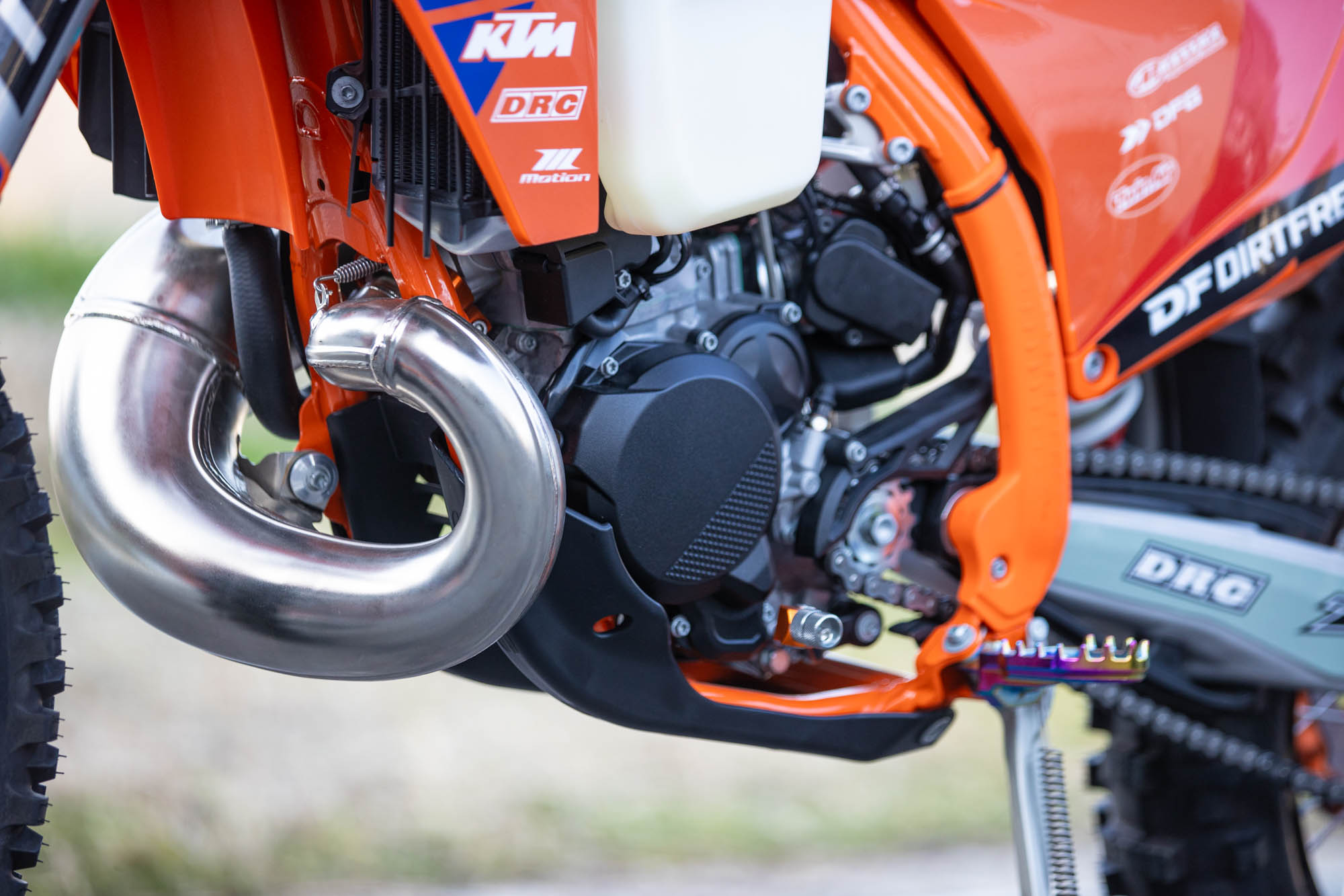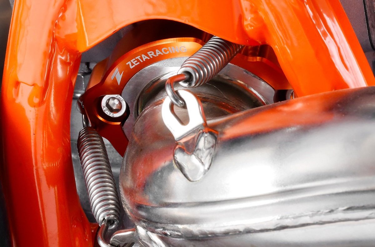 さらに、2ストローク車特有の弱点であるシリンダーフランジを保護するエキゾーストフランジガードを装着。万が一の転倒でチャンバーを強打しても、シリンダーへの致命的なダメージを軽減する、実戦フィードバックから生まれたサバイバルのための装備が光ります。