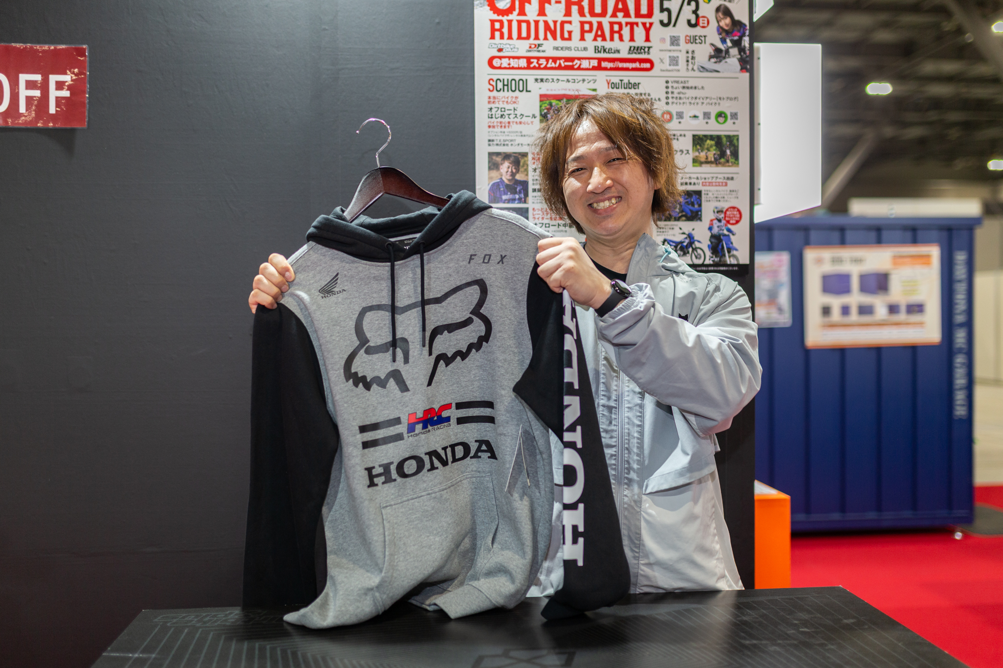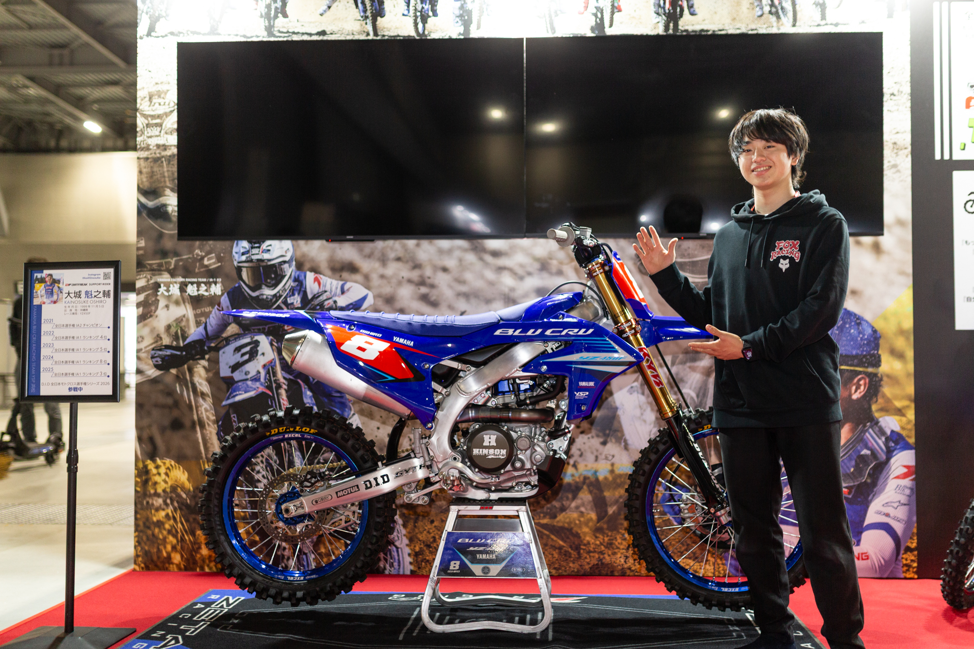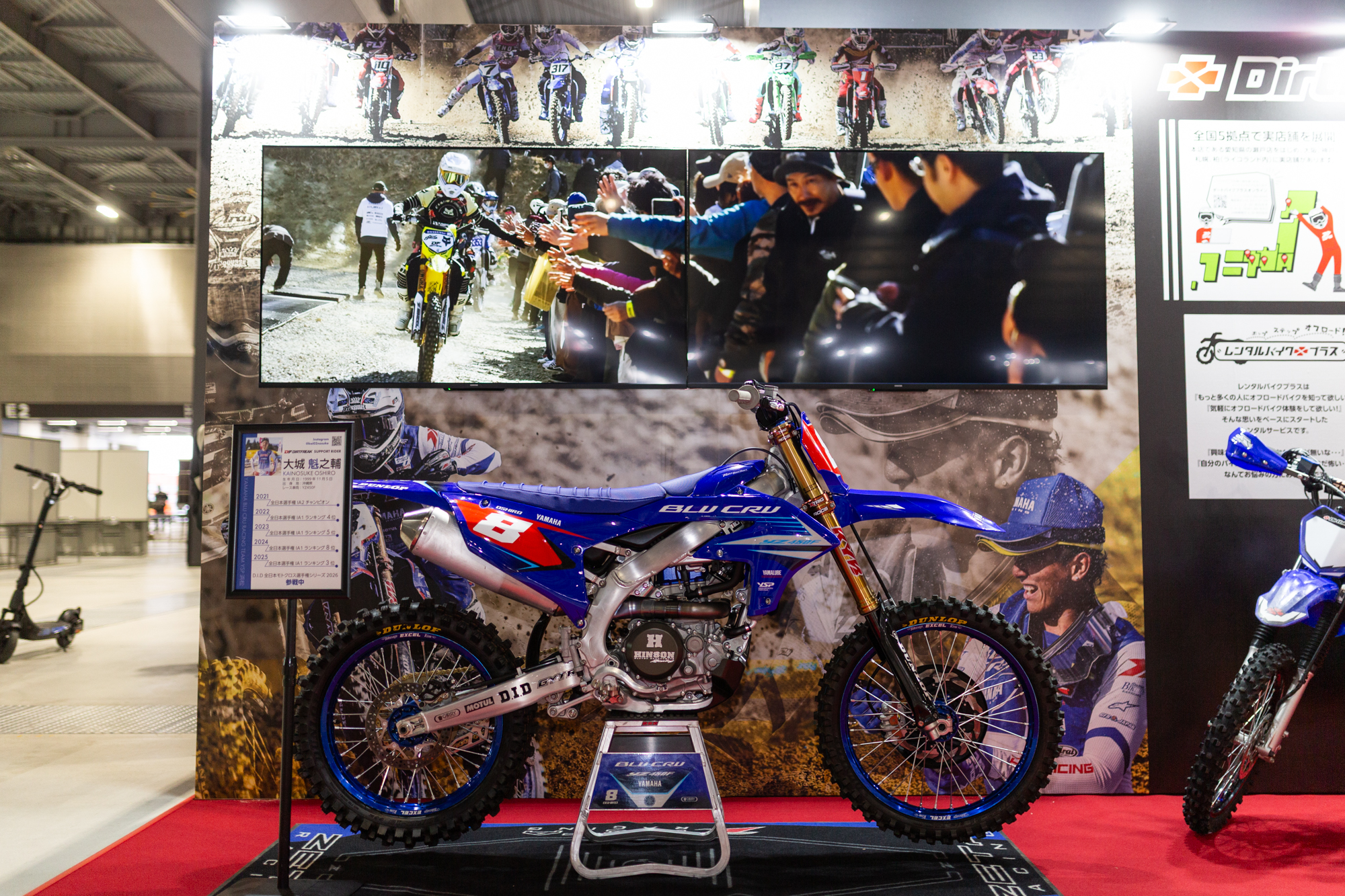 展示スペースは、どなたでも自由に撮影をお楽しみいただけるフォトスポットになっています。全日本を戦い抜いた大城選手のYZ450Fや、こだわりのカスタムマシンをバックに、ぜひブースに来た記念としてシャッターを切ってください。