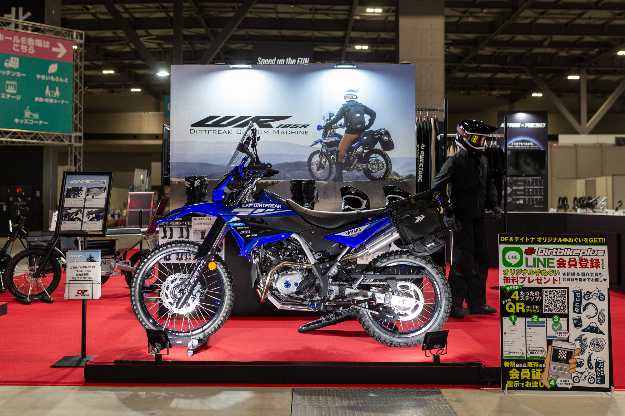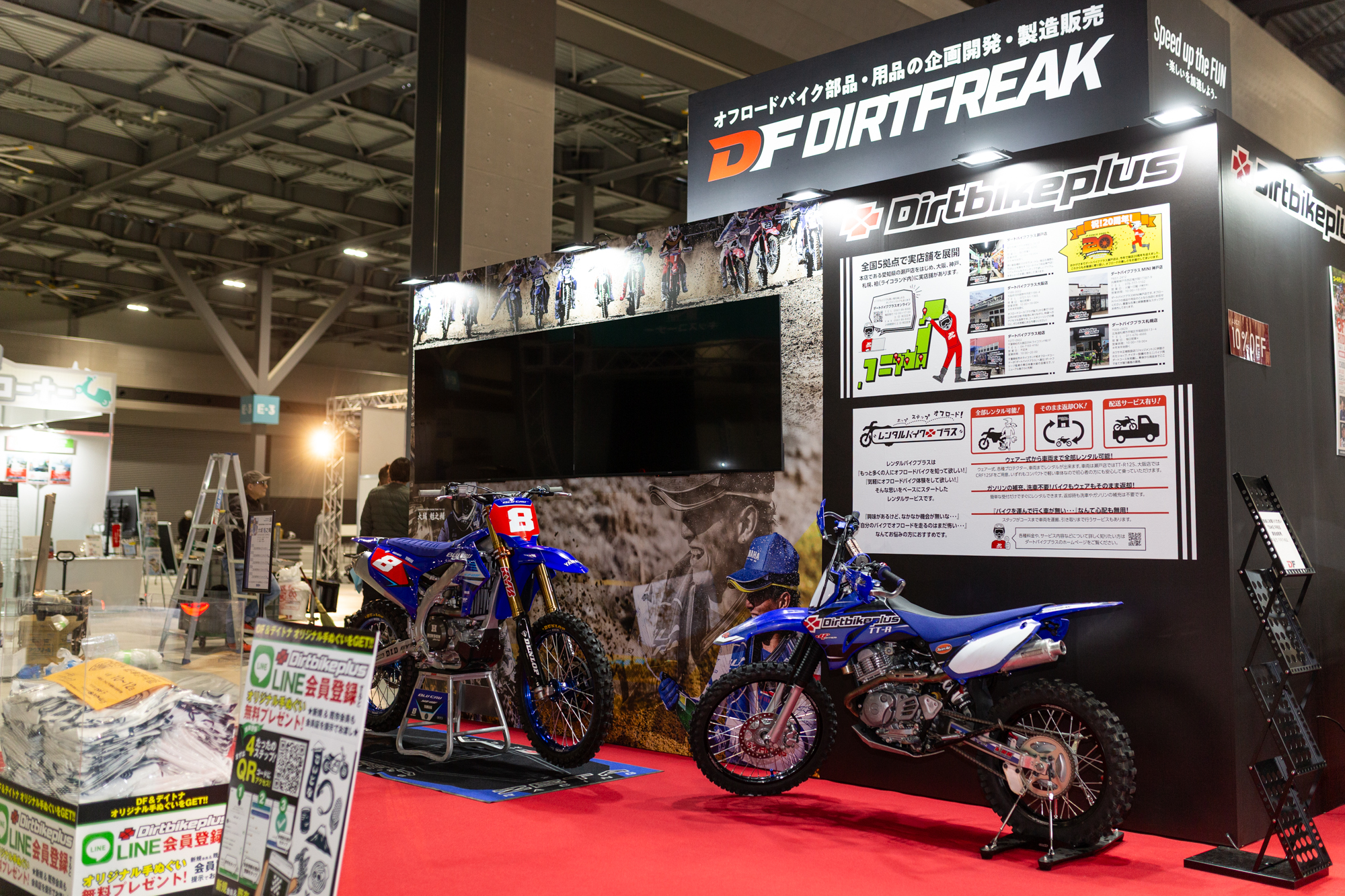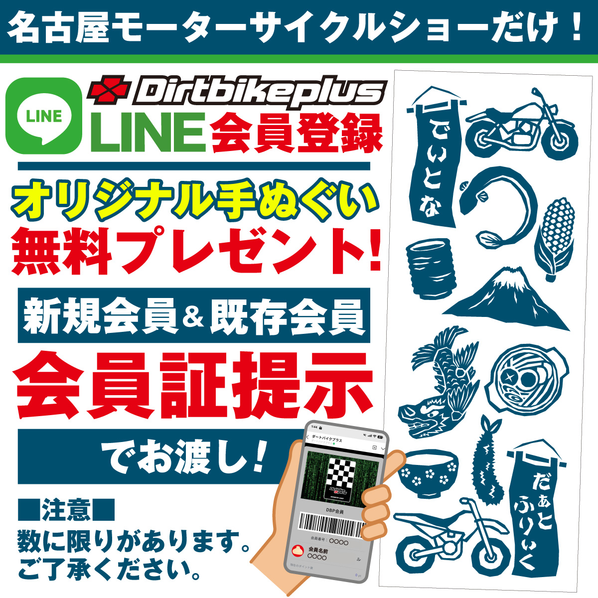 ダートフリークブースでは、 会場でダートバイクプラスのLINE会員登録いただくか、新規会員/既存会員証をご提示いただいた方に特別ノベルティとして「オリジナル手ぬぐい」をプレゼントします。オフロードへの第一歩を、ぜひここから。 ダートフリークブースで皆さんをお待ちしています!