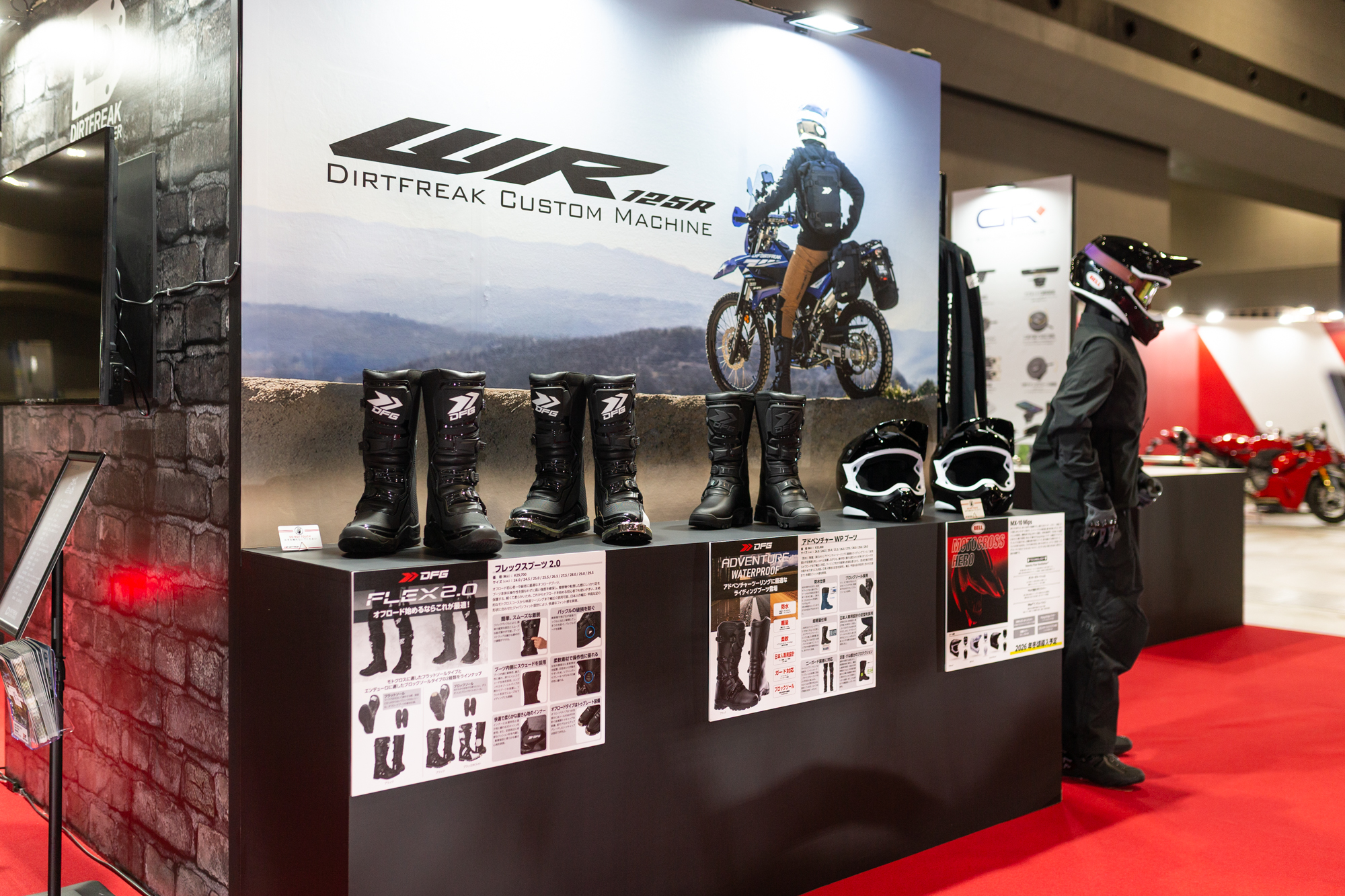 また、車両のそばにはオフロードを始めるための装備として、ダートフリークが展開するブランド「DFG」のフレックスブーツ2.0やアドベンチャーWPブーツ、さらにBELLのヘルメットを展示。「オフロードを走ってみたいけど、どんな装備を揃えればいいのかわからない」と悩んでいる方は、ぜひこの展示を参考に、イメージを膨らませてみてください。